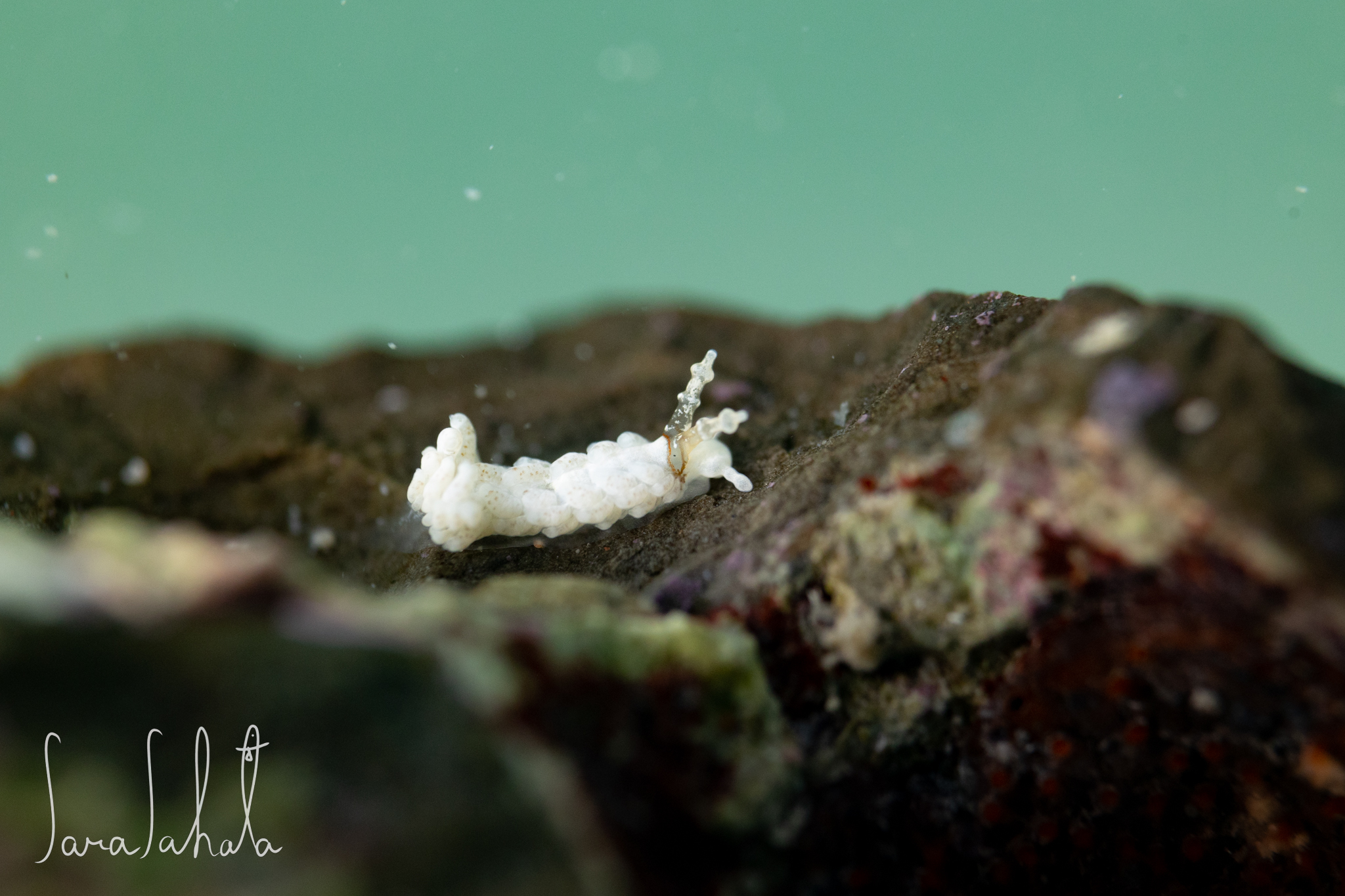 シロミノウミウシ 2023.08.122025.07.28 軟体動物 > 腹足綱 > 裸鰓目 > 枝鰓亜目 > オオミノウミウシ科 Bulbaeolidia alba (Risbec, 1928) 2023/2/26 城ヶ島 -3m 名前の通り白いミノを持ったウミウシ。 1cm以上あったかな? 背景が可愛かったら楽しいんですが。。。 2023/2/26 城ヶ島 -3m メイン写真の子とは別個体です。 同じような海藻に乗っていました。 2024/12/29 葉山 -3m よくみるとアイマスクしてるみたいなんですね。ひょうきんな感じで可愛い。 2025/7/26 葉山 -2m