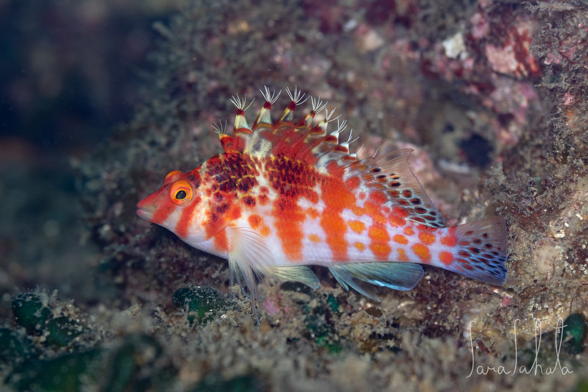 サラサゴンベ 2023.02.052025.10.11 脊索動物 > 条鰭綱 > サンフィッシュ目(旧スズキ目) > ゴンベ亜目 > ゴンベ科 > オキゴンベ属 Cirrhitichthys falco Randall, 1963 2023/2/5 赤沢 -20m 伊豆でずっと会いたかった子。 沖縄とか行けばいるんだろうけど 探してたら赤沢の充さんが、 いるよ!って教えてくれました!! めっちゃ可愛い。 この日は3ダイブ全部サラサゴンベに会いに行ってしまいました。 2023/2/5 赤沢 -20m ヒメゴンベとすごい似てますが 赤い帯のような模様が入いっていれば サラサゴンベです。 2023/8/17 坂田 -15m いると知らずに潜っていたので たまたまあえて感動。 いるところにはいるんですね。 2023/8/17 坂田 -15m 上の写真と同一個体。 2023/10/1 赤沢 -35m 推しにまた会えました!尾びれが青くグラデーションしてめちゃくちゃ綺麗です。 2025/9/15 坂田 -20m この日は奇跡のサラサハタが出てたのでサラサゴンベとサラサエビと撮って1ダイブで3サラサを狙える最高の日でした。