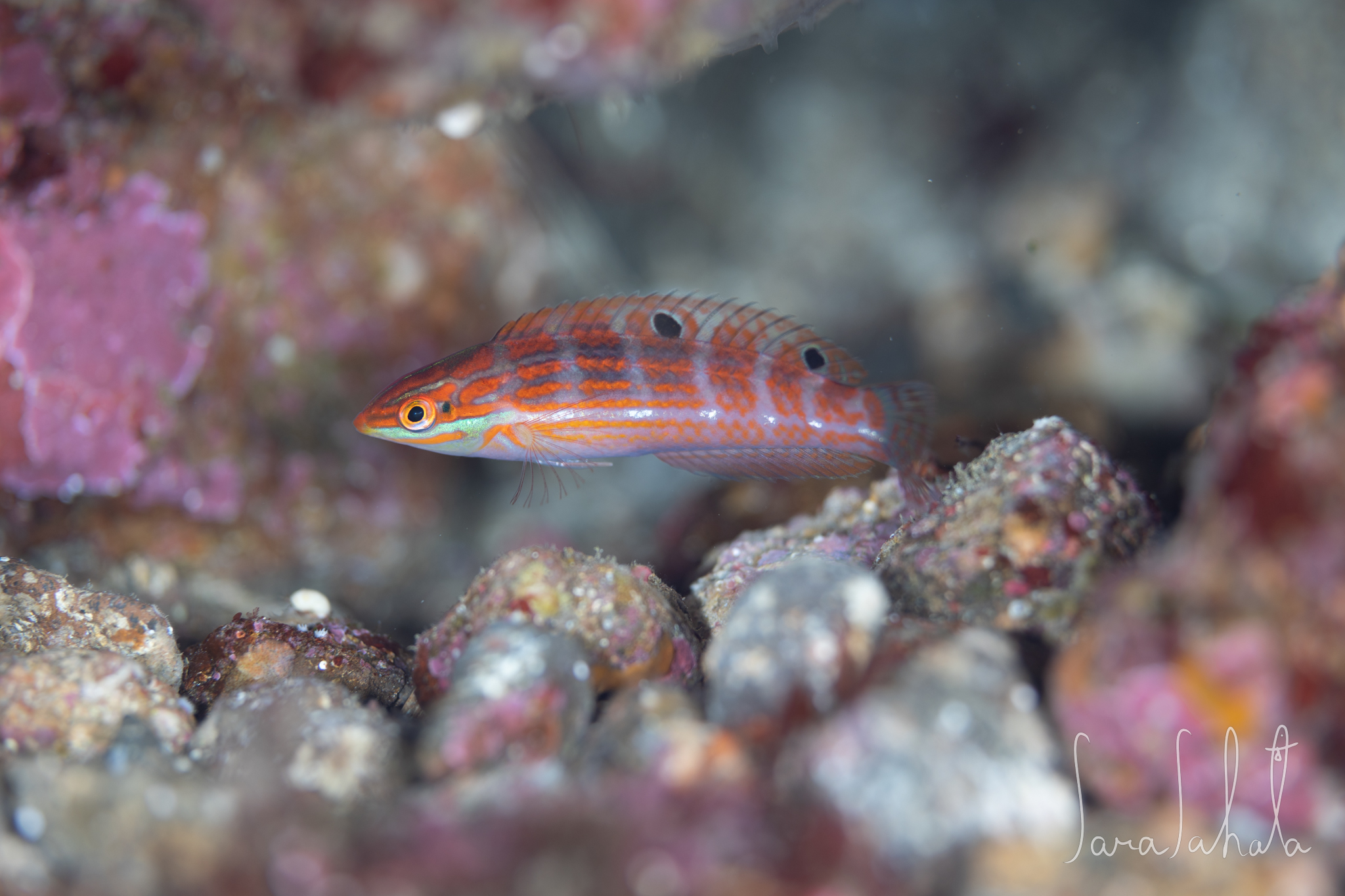 ツキベラ 2023.12.182025.06.15 条鰭綱 > スズキ目 > ベラ科 > ホンベラ属 Halichoeres orientalis Randall, 1999 2023/5/10 赤沢 -25m スジベラに似てる気もしますし、ニシキキュウセンとも似ている気がします。 ベラらしくビュンビュン泳ぎ回ってました。 2025/3/20 赤沢 -25m 前回よりだいぶ小さい5cmくらい?あんまり動き回らず撮りやすい。
